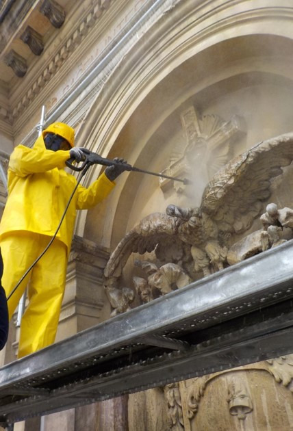 En términos generales para la restauración se liberaron las construcciones adosadas en las torres sur y norte, las cuales afectaron los muros de la edificación, con la desaparición de molduras, y generando problemas de filtración de aguas lluvias. También y de acuerdo al proyecto estructural se realizaron las excavaciones alrededor de los muros de la fachada principal para realizar refuerzos estructurales y consolidar la fachada principal.  Todos los elementos faltantes de la fachada principal fueron restituidos, tales como molduras en piedra, molduras en cemento coloreados, cornisas, y demás elementos constitutivos de la decoración. En algunos casos se tuvieron que hacer los moldes, para ello se tomaron las improntas de los originales y se volvieron a realizar las piezas en cemento coloreado color piedra. También se realizaron restituciones de molduras en piedra, se desalinizaron y se aplicaron biocidas en molduras, esculturas, escudos y decoraciones.