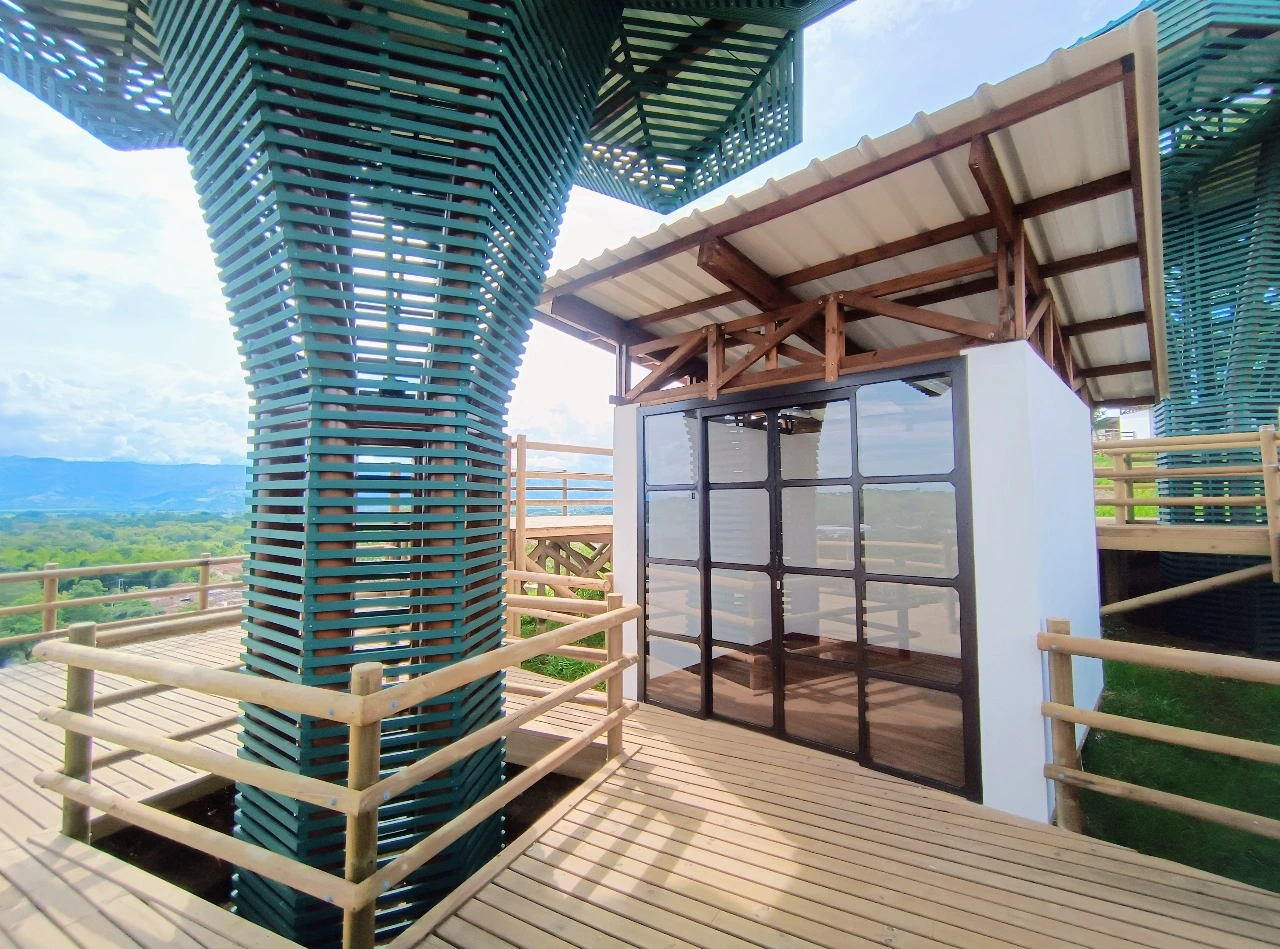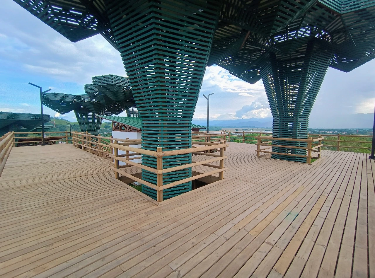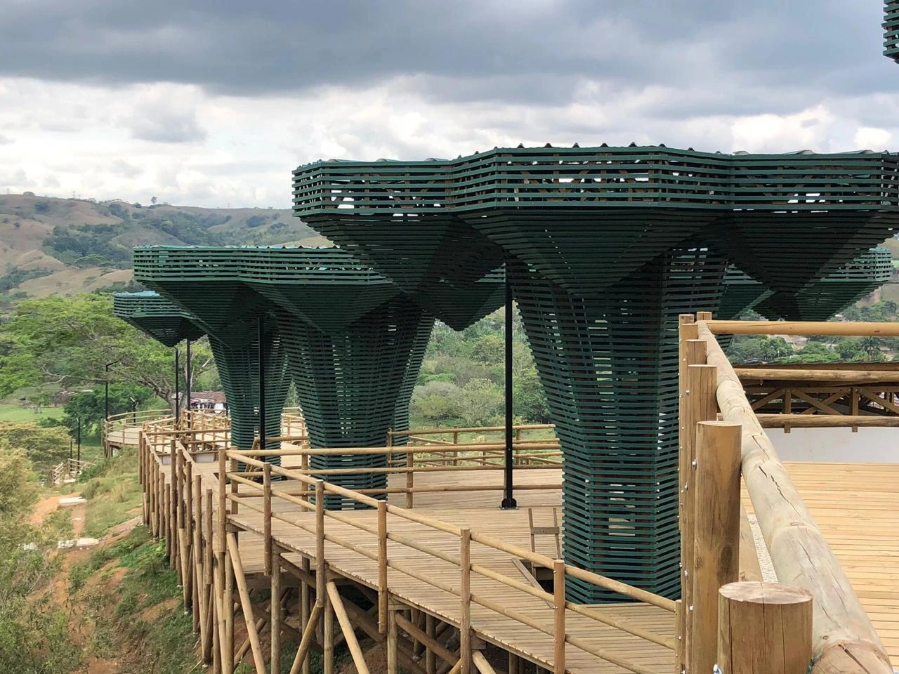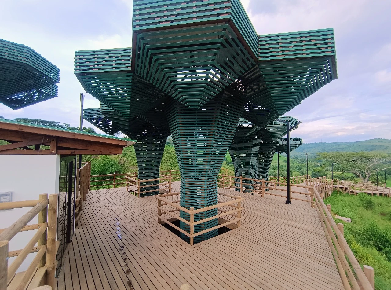 • Los miradores o plataformas: son 8 terrazas con un área aproximada de 900 m2, es el mayor atractivo y foco del proyecto al ser una secuencia de terrazas en madera que se mimetizan con el entorno y que además de poder disfrutar las visuales que nos ofrece el sitio, cuenta con módulos de ventas que soportan la estadía para el proyecto y unos elementos arquitectónicos en forma de Árbol muy llamativos que generan sobra y lugares de estancia temporal y transitorio a los visitantes.