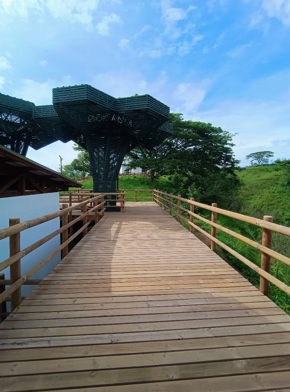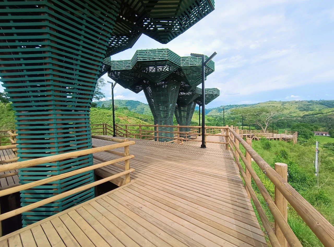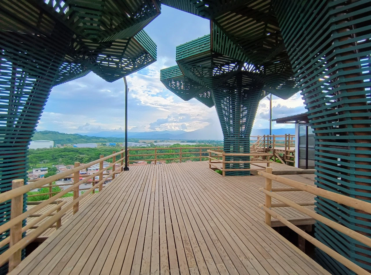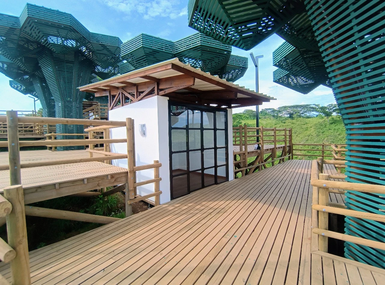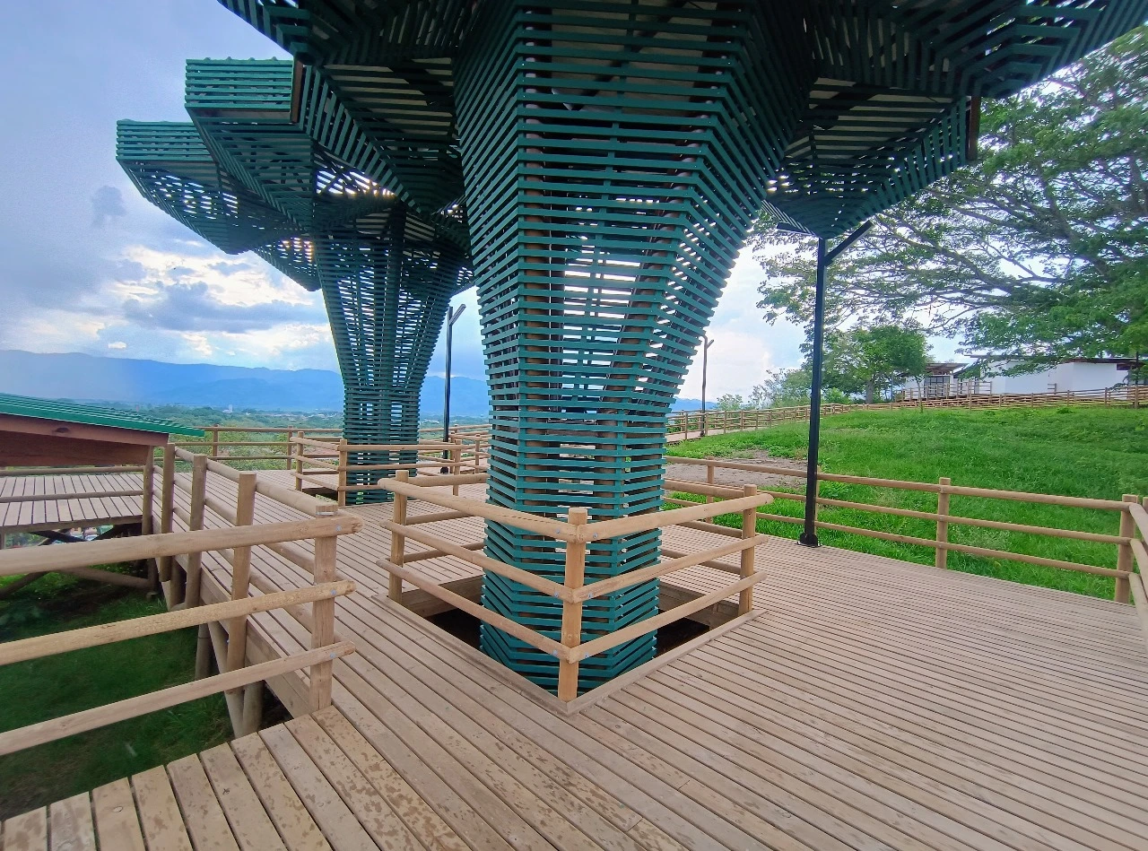 • Los miradores o plataformas: son 8 terrazas con un área aproximada de 900 m2, es el mayor atractivo y foco del proyecto al ser una secuencia de terrazas en madera que se mimetizan con el entorno y que además de poder disfrutar las visuales que nos ofrece el sitio, cuenta con módulos de ventas que soportan la estadía para el proyecto y unos elementos arquitectónicos en forma de Árbol muy llamativos que generan sobra y lugares de estancia temporal y transitorio a los visitantes.