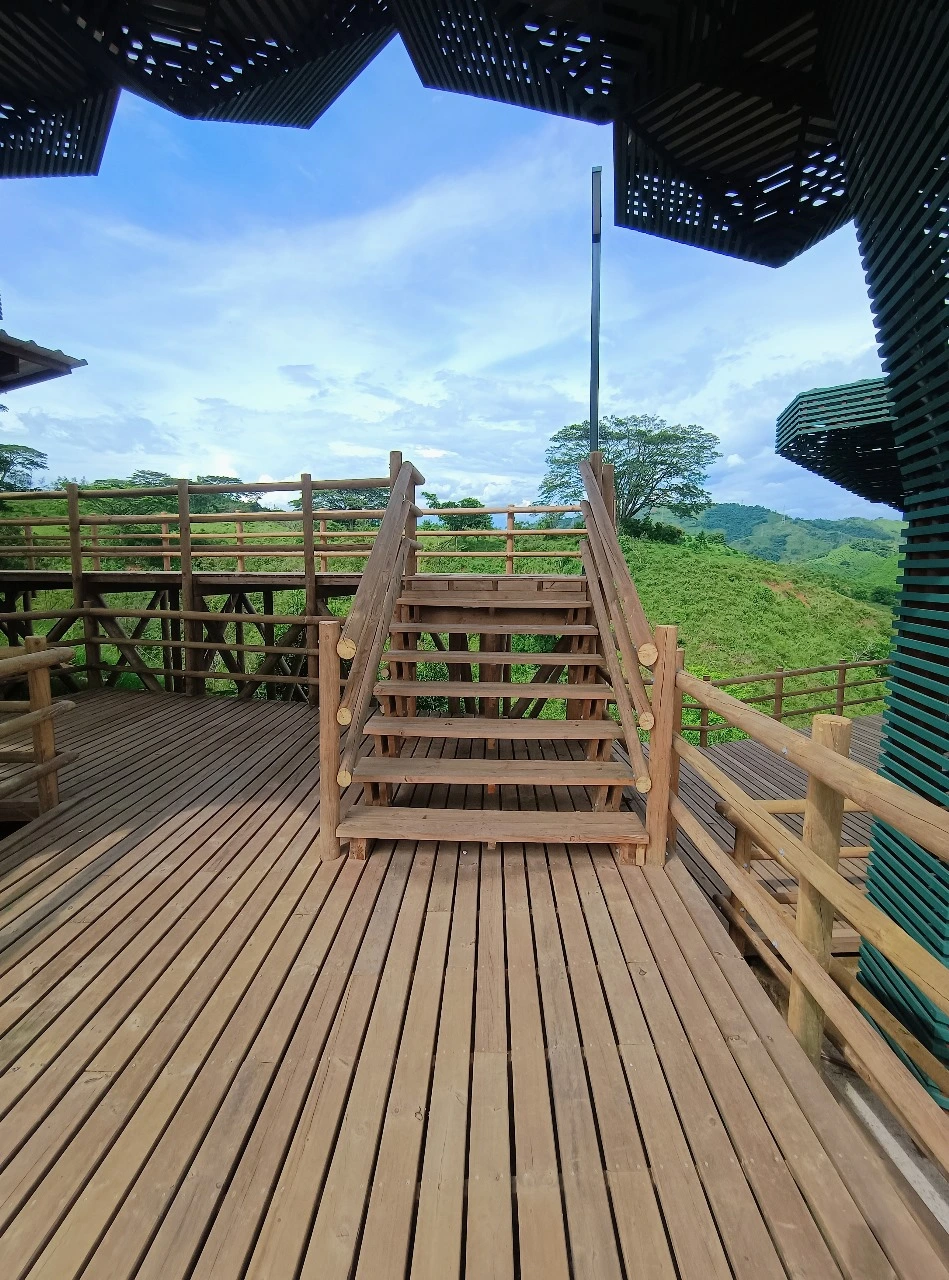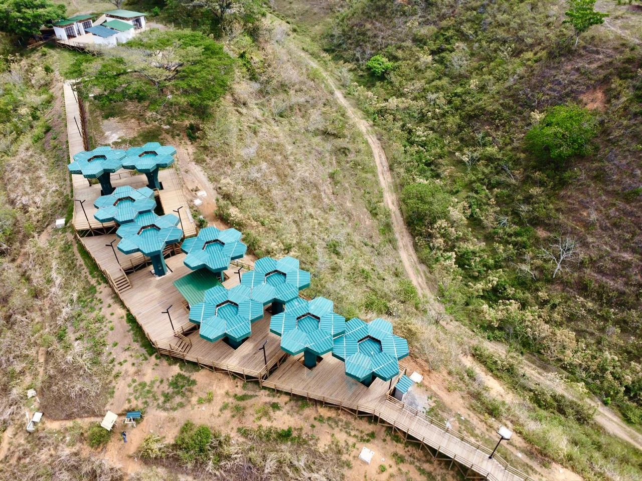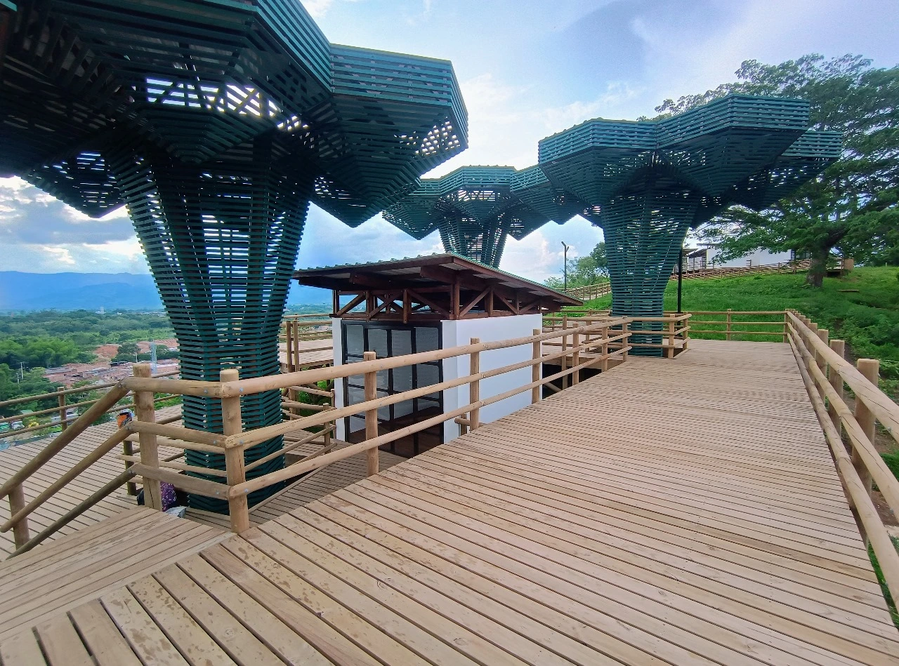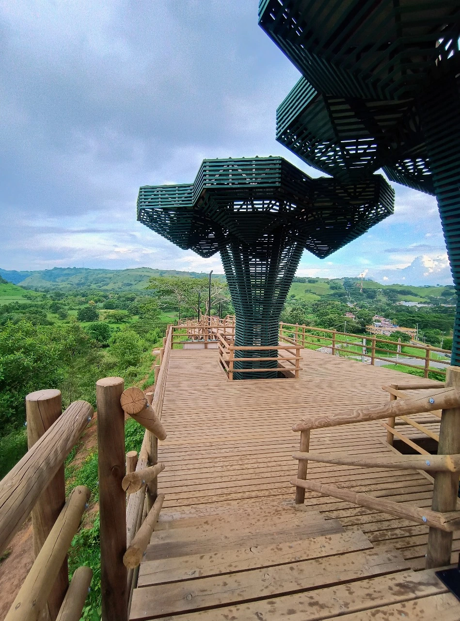 • Los miradores o plataformas: son 8 terrazas con un área aproximada de 900 m2, es el mayor atractivo y foco del proyecto al ser una secuencia de terrazas en madera que se mimetizan con el entorno y que además de poder disfrutar las visuales que nos ofrece el sitio, cuenta con módulos de ventas que soportan la estadía para el proyecto y unos elementos arquitectónicos en forma de Árbol muy llamativos que generan sobra y lugares de estancia temporal y transitorio a los visitantes.