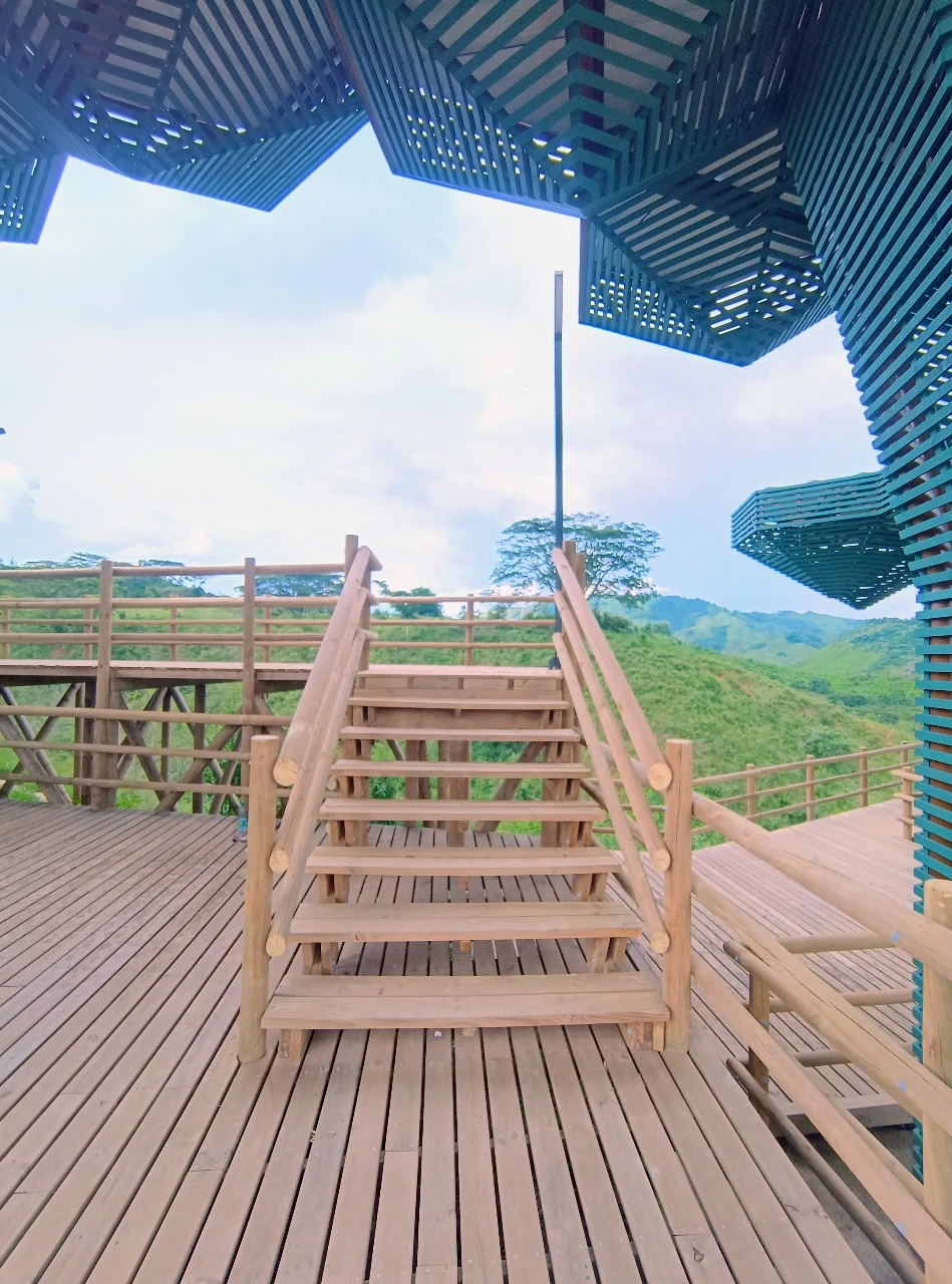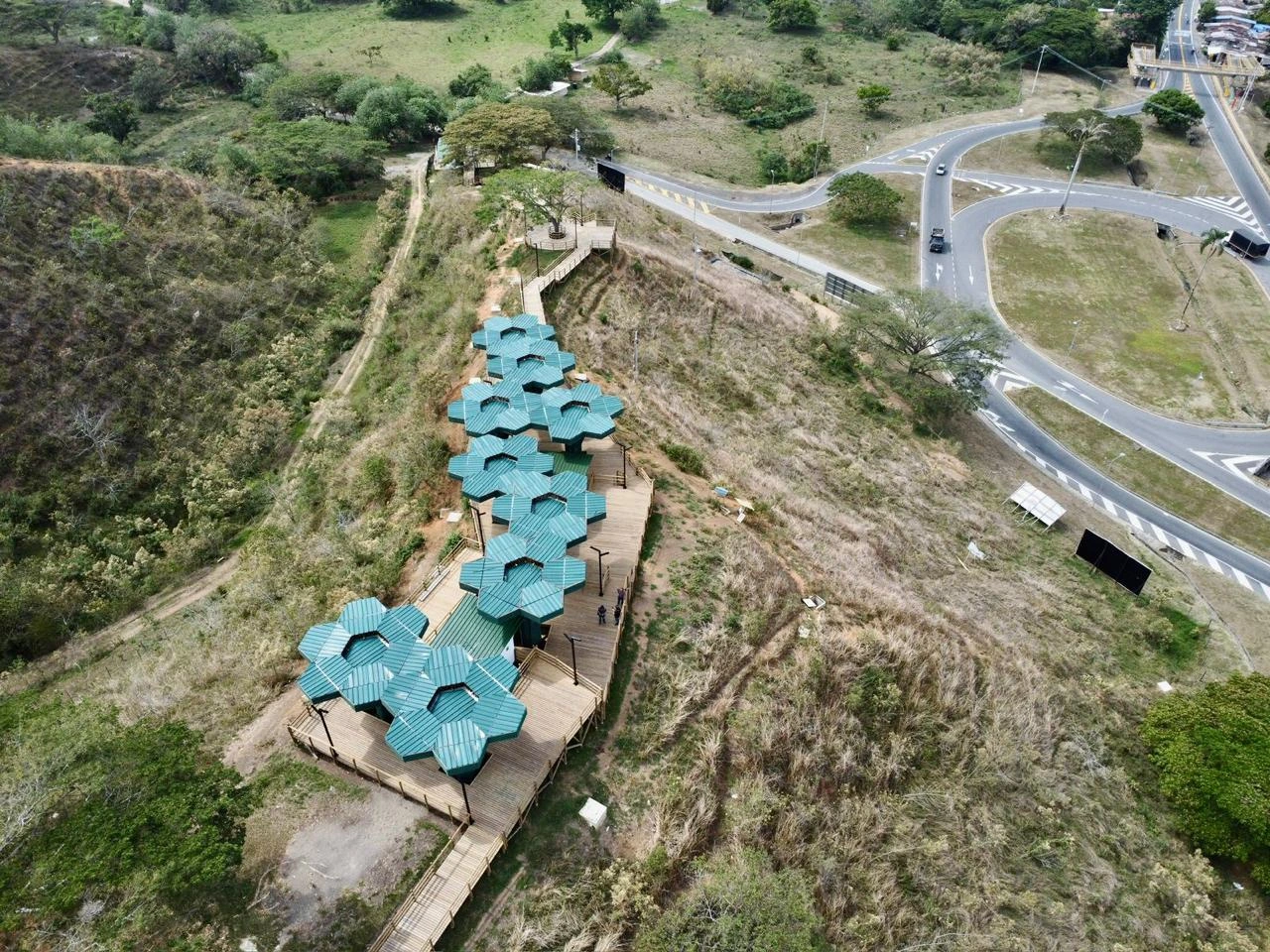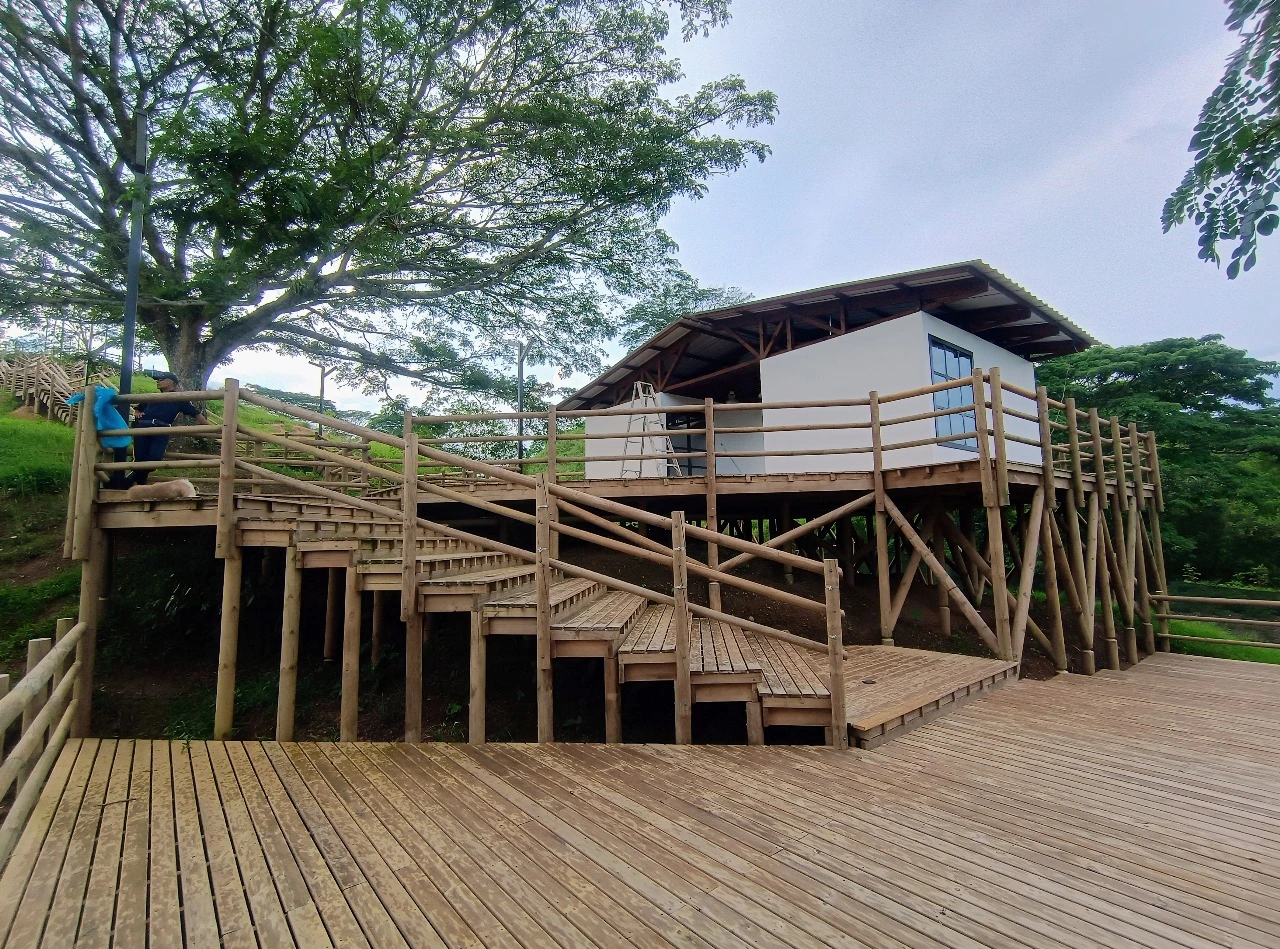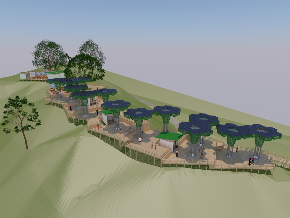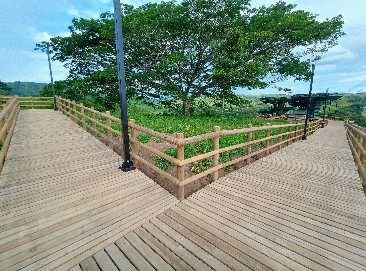 • Los miradores o plataformas: son 8 terrazas con un área aproximada de 900 m2, es el mayor atractivo y foco del proyecto al ser una secuencia de terrazas en madera que se mimetizan con el entorno y que además de poder disfrutar las visuales que nos ofrece el sitio, cuenta con módulos de ventas que soportan la estadía para el proyecto y unos elementos arquitectónicos en forma de Árbol muy llamativos que generan sobra y lugares de estancia temporal y transitorio a los visitantes.