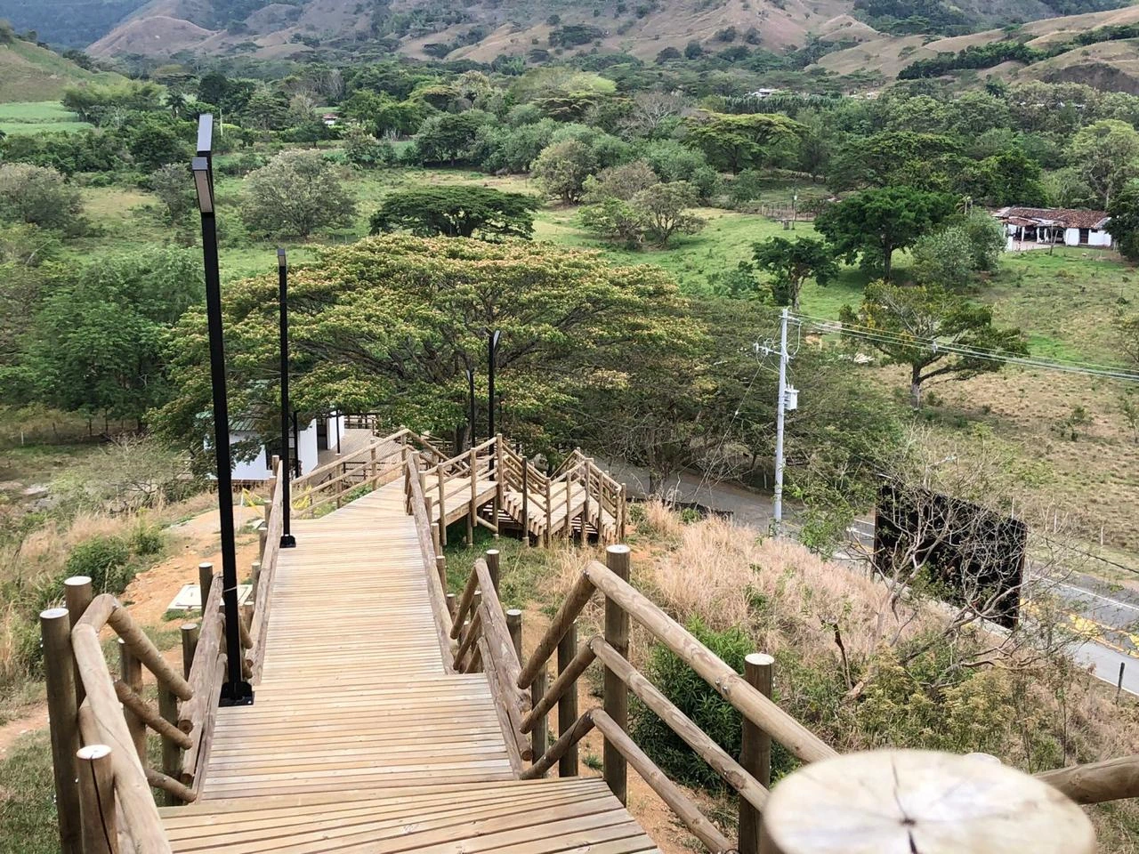 • La plaza de los columpios: Es el gran primer acercamiento a los miradores del proyecto, se ubica en un punto estratégico sobre el filo de la ladera, desde donde se logran apreciar los paisajes típicos del eje cafetero. Cuenta con un módulo de sillas/columpios para adultos y niños que ayudan a reforzar el espacio como lugar de transición temporal.