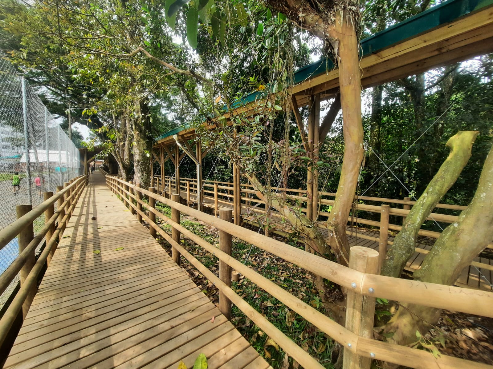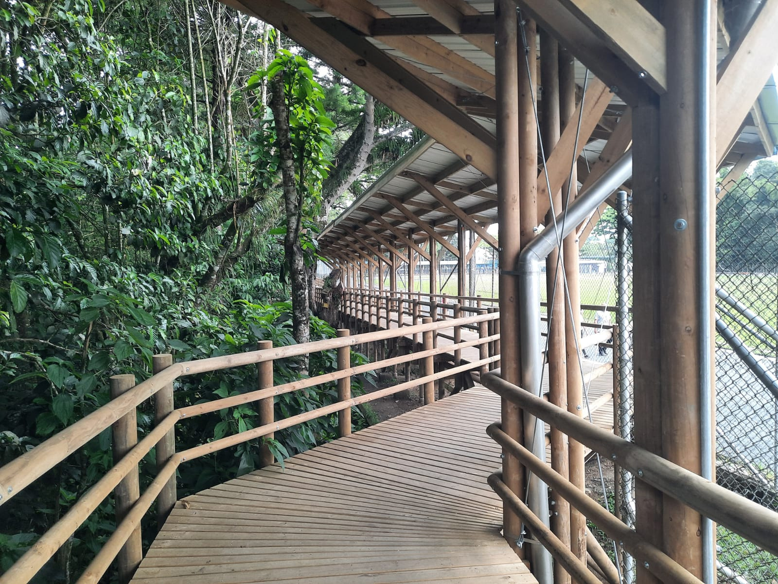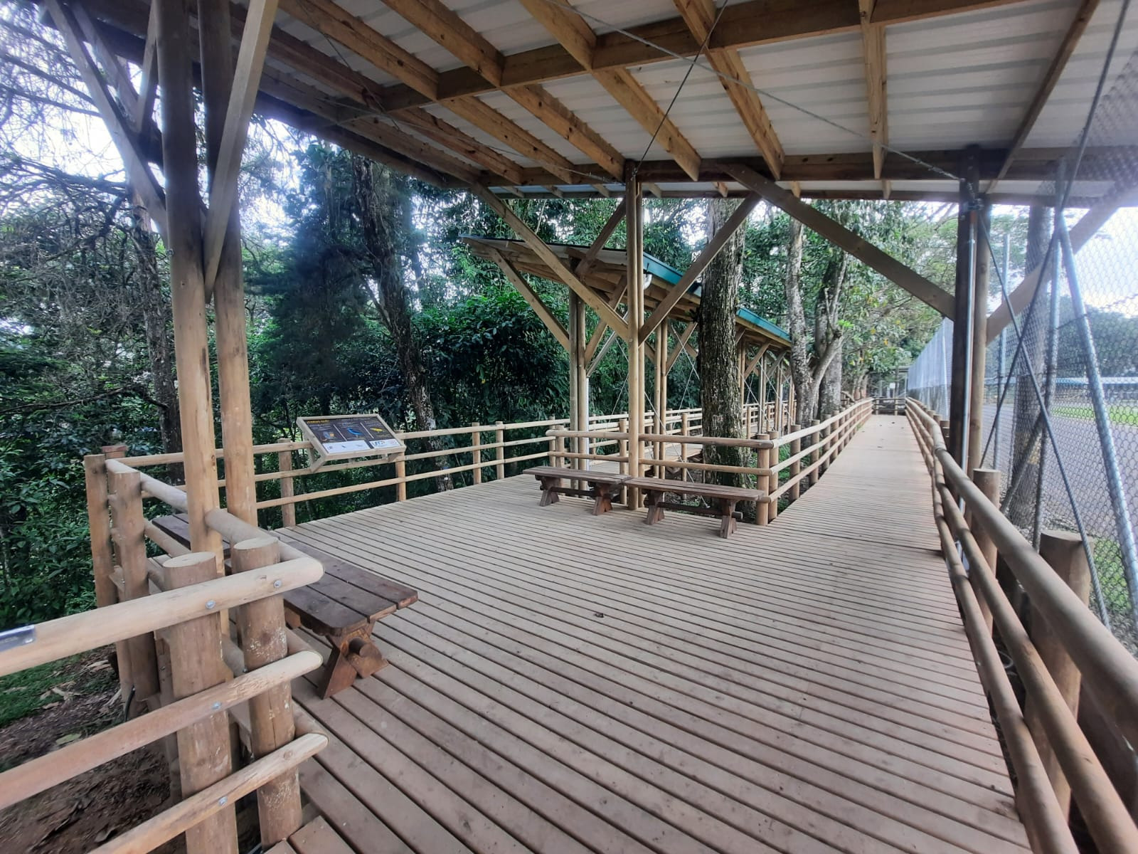 El sendero cubierto se extiende por más de 200 metros de longitud y cuenta con cuatro áreas de descanso estratégicamente ubicadas a lo largo del recorrido. Estas áreas ofrecen no solo un espacio para el reposo, sino también la posibilidad de contemplar el bosque existente en la zona de intervención, convirtiéndose en miradores naturales. Además, están equipadas con mobiliario de madera para mayor comodidad de los usuarios.
